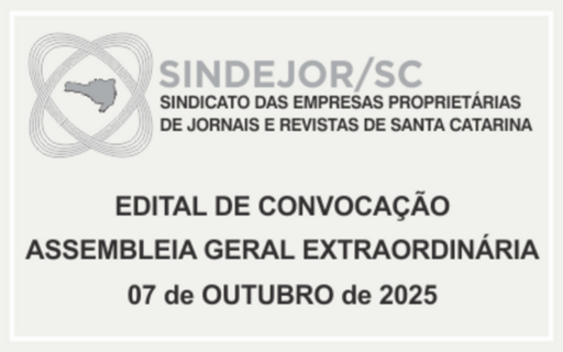 No dia 07 de outubro, terça-feira, o Sindejor/SC - SINDICATO DAS EMPRESAS PROPRIETÁRIAS DE JORNAIS E REVISTAS DO ESTADO DE SANTA CATARINA realizará Assembleia Geral Extraordinária para aprovação de nova redação de seu Estatuto.